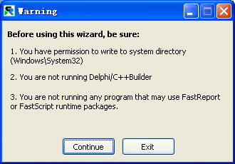 2. 程序运行后出现提示,主要是目录读写权限、C++Builder是否运行、是否有其它程序运行FastReport的部件包,点击“Continue”。