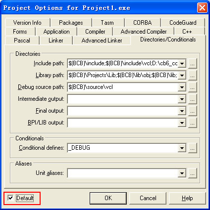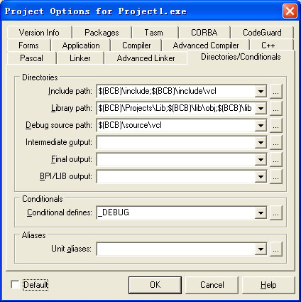 1. 点击BCB菜单“Project”->“Options”,选择“Directories/Conditionals”的标签栏。