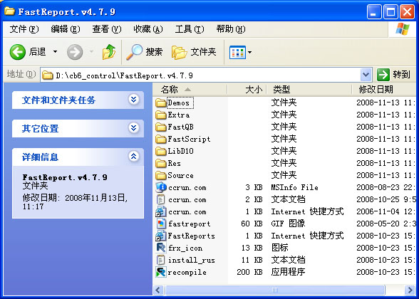选择一个目录进行安装,现在以D:/cb6_control目录为例,将下载的FastReport V4.7.9解压到此目录。