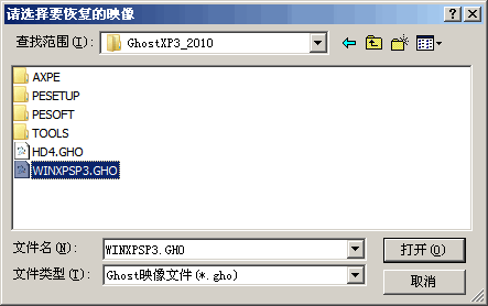 图11 在“查找范围”里面,找到你下载或者保存的恢复系统的.gho映像文件,比如WINXPSP3.GHO,打开。