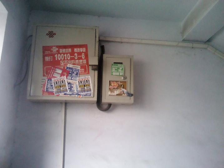 4楼的图,白色的管为走线管,通过楼梯与楼梯传上去的,估计建楼时还没10M的概念。