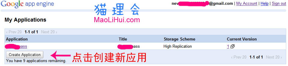点击send后,Google App Engine账号即被激活,然后就可以创建新的应用程序了。页面会自动转入“My Applications”页面,点击“Create an Application”新建应用,如下图: