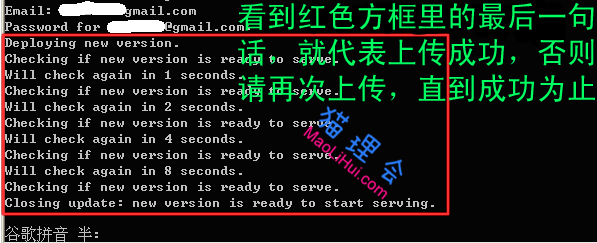 1.解压后会看到2个文件夹,双击server\uploader.bat(linux/mac用户请运行uploader.py),先输入你的appid(不要额外加上.appspot.com),然后会提示你输入Gmail邮箱和密码,(输入密码时将看不见任何符号,但你不用管他,输完密码后按回车就可以了)接着程序会自动上传至谷歌服务器,看到方框内的文字尤其是最后一行就表示上传成功了。